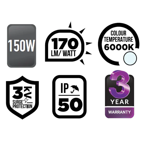 - Built in 2kV (100W) & 3kV (150W) Surge protection creating a robust lamp for demanding environments.